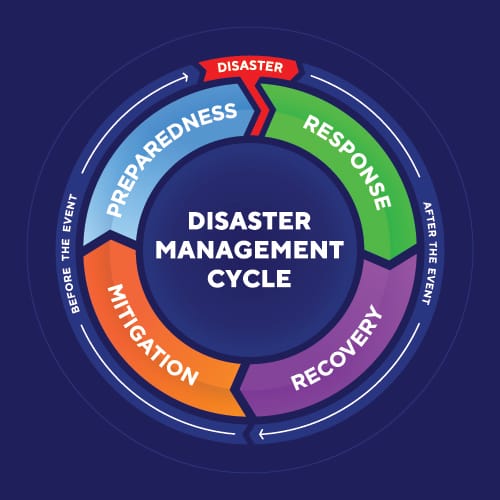 There’s also the impact on preventing disasters, not just responding to them. The disaster cycle is typically depicted as a circle, with four steps: preparedness, mitigation, response, and recovery.